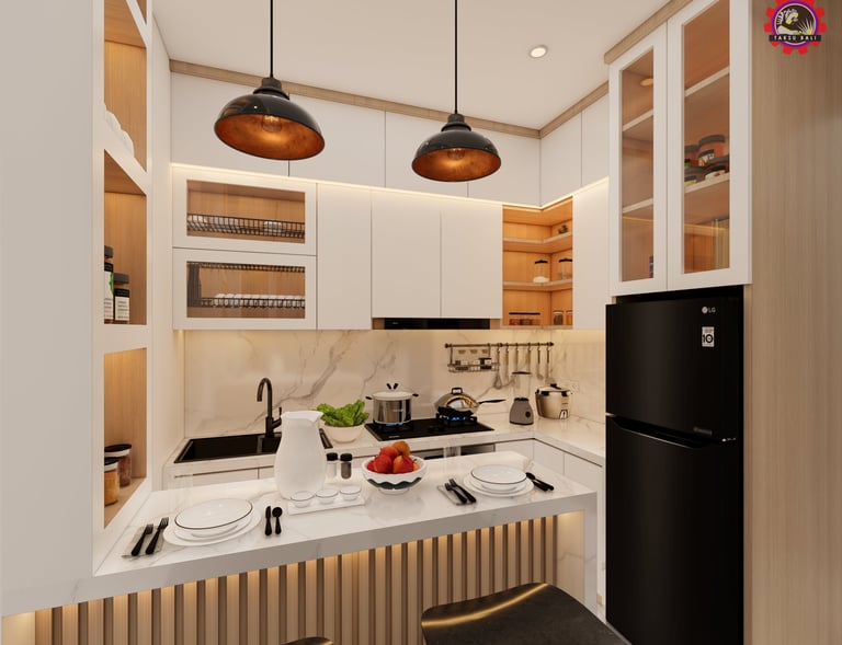 Desain interior personal dengan furniture dan kitchen set yang dibuat khusus sesuai kebutuhan.